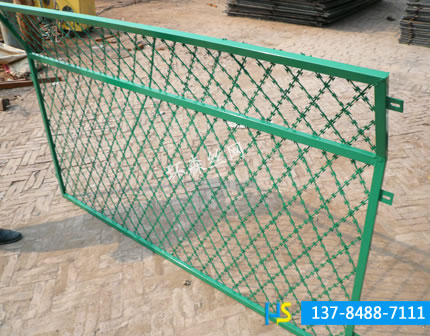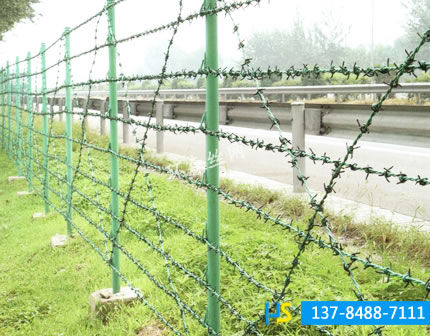 刺絲刺繩護欄網(wǎng)網(wǎng)也稱為刀片刺絲護欄網(wǎng)、刀片刺網(wǎng)護欄網(wǎng),是一種新型護欄網(wǎng)產(chǎn)品。是在兩條刀片刺網(wǎng)之間以不銹鋼片和鍍鋅鋼片強力夾扣,展開后即呈交叉狀。它具有嚇阻效果好、美觀、施工便利,經(jīng)濟實用等優(yōu)異特點。主要用于園林公寓,機關(guān)單位,監(jiān)獄,哨所,邊防等的圈禁防護。刀片刺網(wǎng)是由熱鍍鋅鋼板或不銹鋼薄板沖壓處尖銳的刀片狀,高張力鍍鋅鋼絲或者不銹鋼絲做芯線組合而成的阻絕器材。由于刺網(wǎng)造形獨特不易觸摸,因而能達到極好的防護隔離效果。