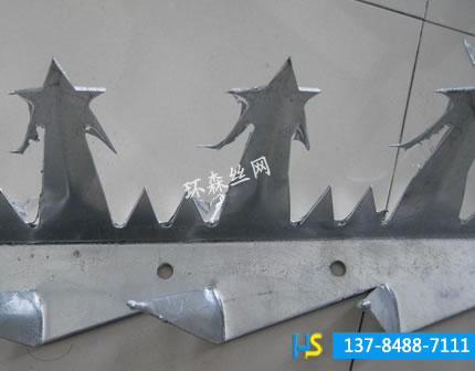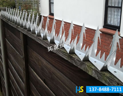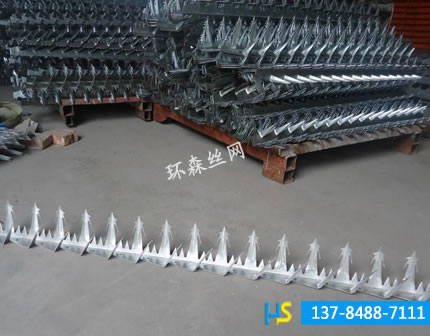 刺釘?shù)陌惭b與制作:本公司自主研發(fā)的全自動(dòng)生產(chǎn)設(shè)備,經(jīng)過(guò)特殊模具沖壓而成,一次性成型,彎曲度精確,強(qiáng)度高,外表美觀,防護(hù)系數(shù)高,用膨脹螺絲固定在墻頭或者金屬護(hù)欄上,安裝方便。